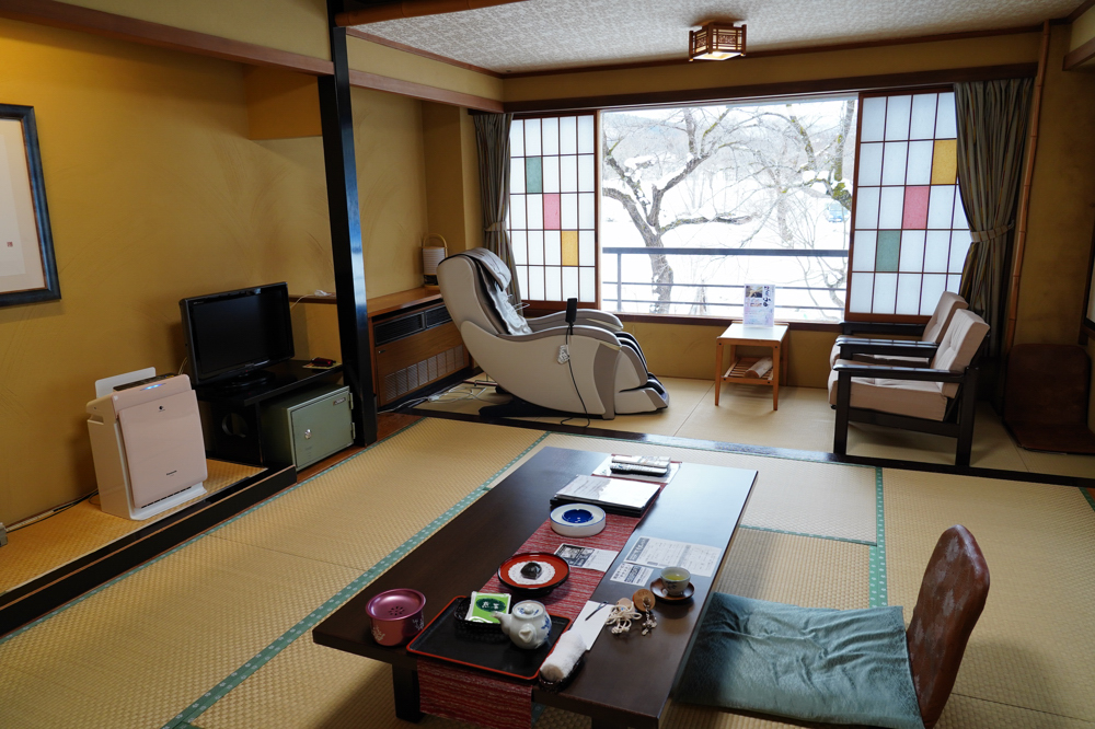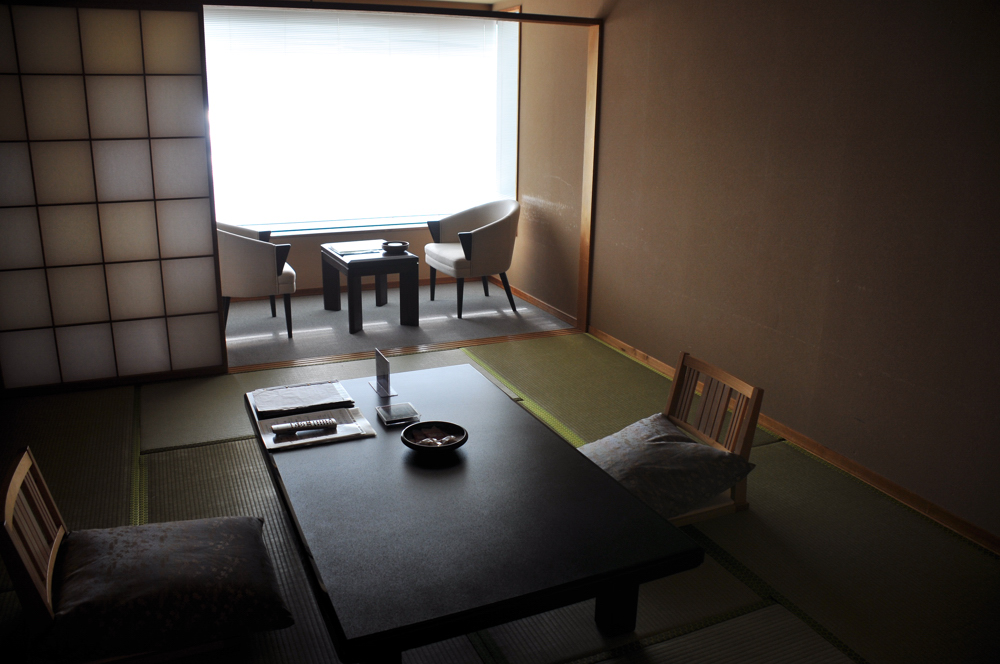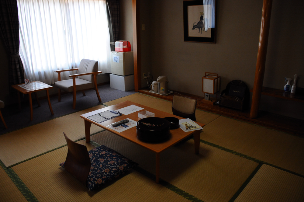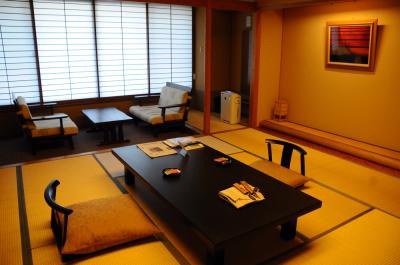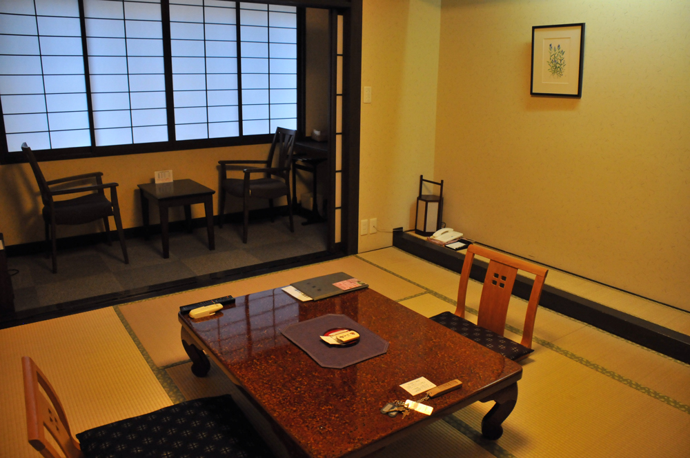 予約したのは一番安い10畳の和室だったが、通されたのは、10畳に4.5畳の次の間が付いた和室に、次の間と同じ広さのリビングが付いたジュニアスイートでした。