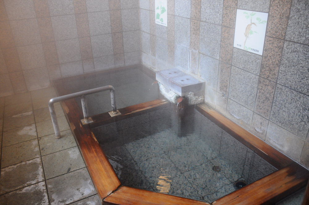 泉質は硫黄泉ですが、タンクに貯めているうちに硫黄臭が抜けてしまうとのことで、やや金氣臭がする薄濁りの湯でした。