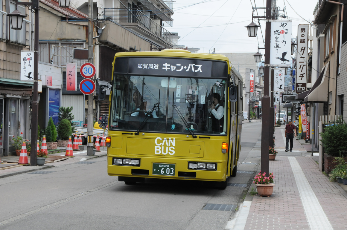 JR加賀温泉駅を基点として、加賀市やその周辺の観光地を巡る周遊バス。山代温泉や那谷寺などを巡る「山まわり」と大聖寺や片山津温泉を巡る「海まわり」があります。1日乗車券(1000円)と2日乗車券(1200円)があり、JR加賀温泉駅を出て左手の発着所や車内で購入することが出来る。一般路線バスの無い片山津温泉や橋立漁港、尼御前岬などへ行く場合には便利だ。山まわりの世界のガラス館バス亭で降りれば、「加賀地ビール館」がすぐです。ただし、一方向の循環バスなので、使い勝手はあまり良くないので注意が必要です。