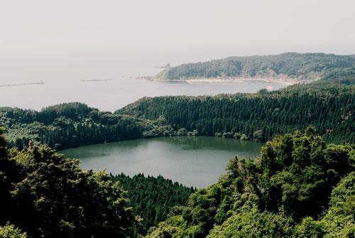 二ノ目潟の奥に戸賀湾が見えますが、これもマールだと言われています。
