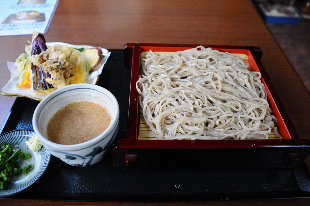 もりそばに野菜天が付いているのだが、そばつゆで食べるのではなく、ゴマクルミだれに付けて食べるという変り種。