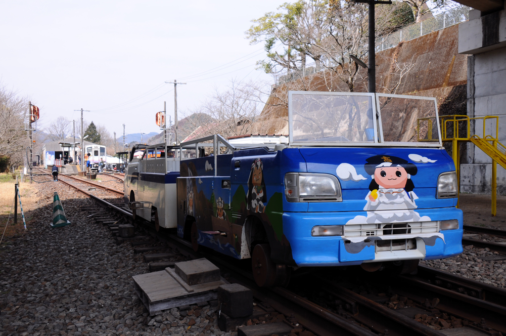 スーパーカートとは、軽トラックを改造して線路の上を走れるようにしたもので、二両編成で定員は18人。