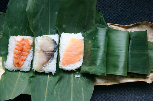 笹で包まれた中には、地元の仁多米を使った鮨飯の上に、海老、鯖、シャケ、うなぎ、鯛、こうたけの6つのネタが載っています。