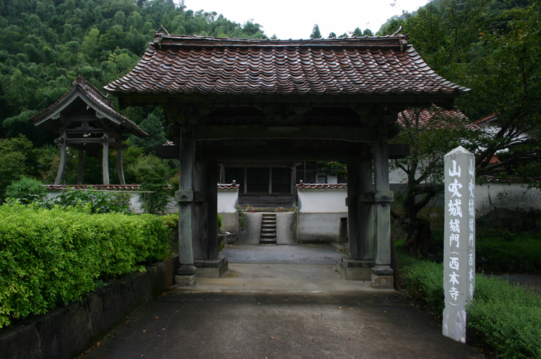 標高414mの要害山の頂上に築かれていた石見銀山支配の拠点だった山吹城の貴重な遺構。廃城となった後、追手門が改造の上、龍昌寺の門に転用され、後に現在の西本寺へ移築されたそうです。石州瓦が載った門は、かつて城門だったとは思えない風情があります。