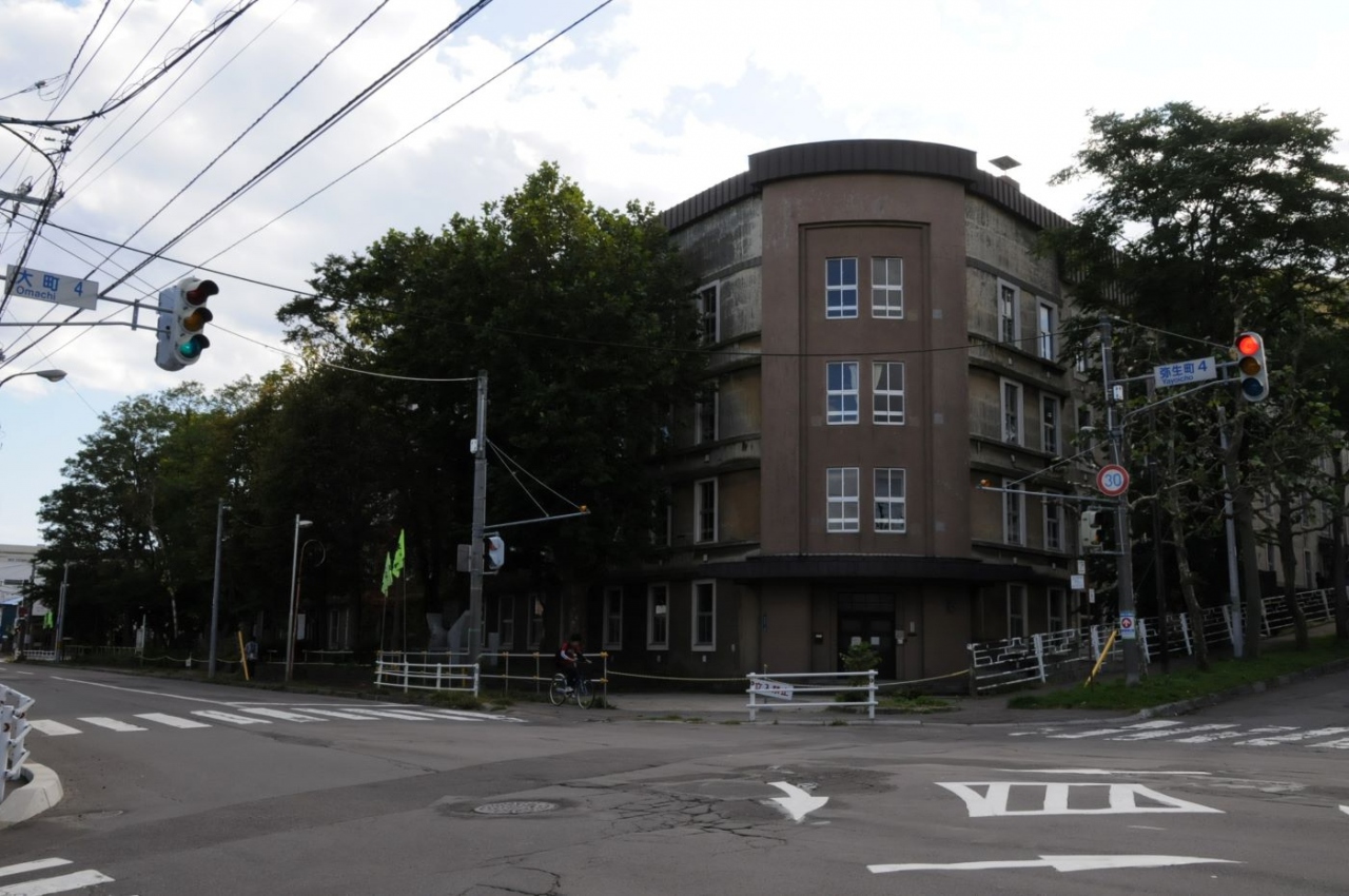 昭和9年の函館大火後の復興事業として、昭和10年(1935)から同13年(1938年)にかけて建てられた6つの小学校のひとつです。鉄筋コンクリート造りの耐火建築で再建され、昭和13年に竣工。北東角の曲線が特徴的な建物です。2009年10月に訪れた時にはすでに閉鎖され、翌年解体されてしまいました。なお、平成24年(2012)に新校舎が建てられた際、旧校舎の特徴であった北東角の曲面外壁が再利用されています。古い校舎と勘違いして訪れる人がいますが、あくまで一部外壁の再利用で、建物自体は新築です。写真は、解体前の旧校舎です。