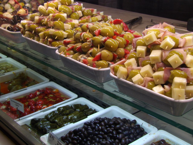 反対側にあるガラスケースの中には皿に入ったタパスが並んでいて、最初に好きなものを選んで出してもらいました。