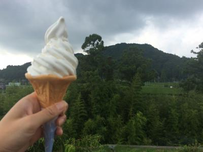 旅がらすのわれせんが刺さったソフトクリームも売っていて、中に座る場所やセルフのお茶やコーヒーもありました。