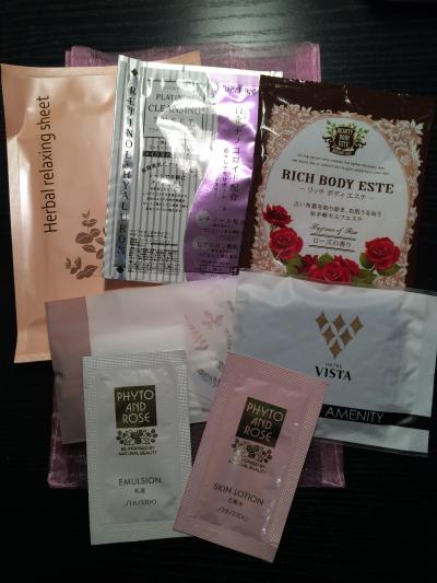 アメニティーは化粧水、乳液、バスソルトにもなるマッサージソルト、クレンジングシート、ふくらはぎなどに貼るリラックスシートが入っていました。