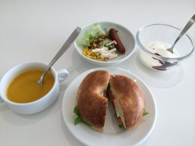 朝食はスモークサーモンとクリームチーズのベーグルにしました。(他にはチキンのサンドの二択)ベーグルはあっためられてて、美味しかったです。他にもサラダ、ウィンナー、ヨーグルト、ドリンク、スープのバイキングがあります。スープを持って来ていたので、遠慮して持ってこなくて後悔していたコーヒーをお持ちしましょうかと声をかけてくれたのが嬉しかったです。コーヒーも美味しかった。- 旅行時期