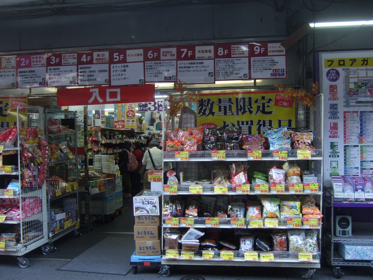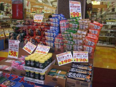 JR御徒町駅からアメ横に入り、どんぶり物やたこ焼きを売ってる店の脇を入ってすぐのところにあります。左側の店舗はお菓子メイン、右側はお菓子を含めていろんな食品や飲料が売られてます。近所にライバルの多慶屋があるので、両方見比べた方がいいかも?物によっては半額だったりします。以前よりも営業時間がのびたようで、20時までやってます。
