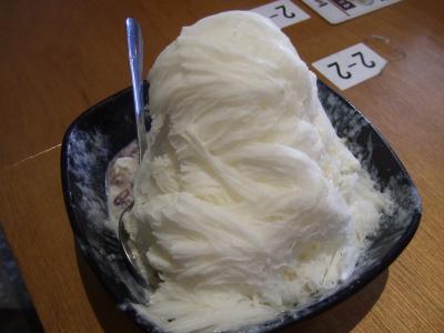 かき氷店にありがちなコンデンスミルクではなく、エバミルクがかかってます。