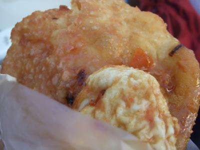初めて食べた時は卵が半熟で美味しかったのですが、今回は完全に火が通ってました。だから、あんまり甘さを感じず。すでに揚がってるのを渡されました。