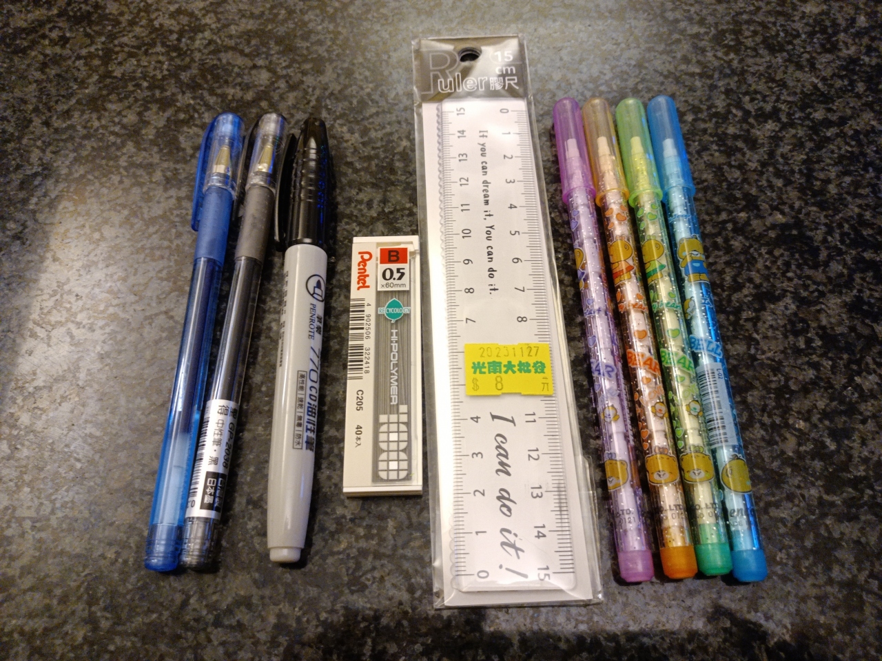 定規を買いました。ロケットペンシルは5元、定規は8元でした。
