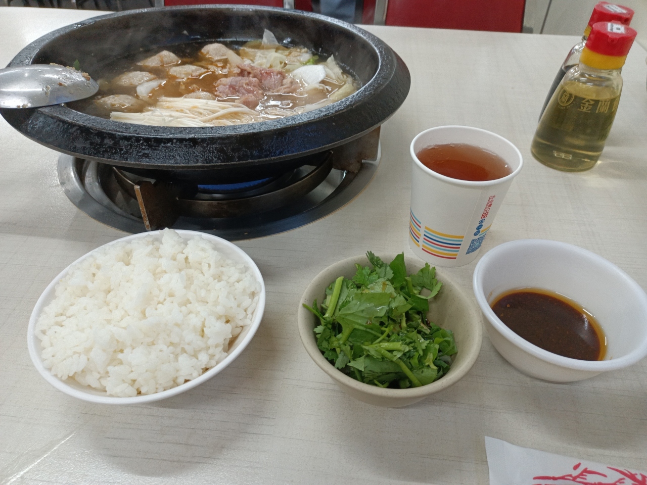 豚肉 白菜 えのきだけ 胡椒のきいた団子 白飯 これらの合計が250元。