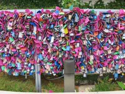 恋人岬にあやかってか恋人との名前を書いたプレートが沢山付けられていますが、付ける柵(?)以外の場所(岩場)にも付けられており、「これいいのか?」と思いました(ハングル多し)。- 旅行時期
