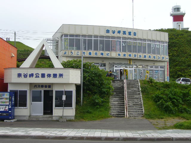 自分は最初、展望台はこの売店の横の坂道を登って行った所にある望楼のことだと思っていましたが、よく見たら売店の建物に「宗谷岬展望台」と書いてありました。