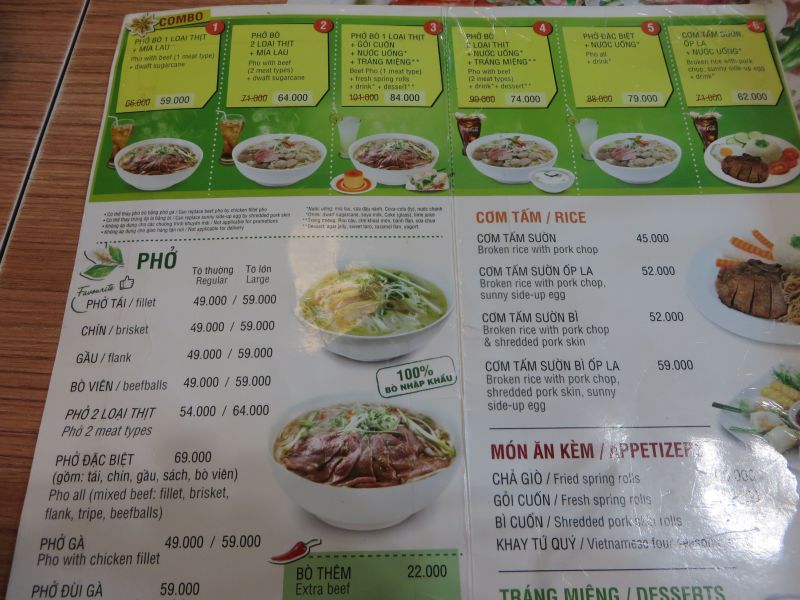言葉が通じなくても、わかりやすいメニューがあり、指さしで注文できたので助かりました。ベトナム到着当日で、初めて食べた「フォー」でしたので、他の店などとの比較ができませんが、ボリュームがあり、味にむらがなく、野菜などもたくさん入っていたので気に入りました。