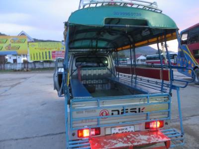 あらかじめ乗る前に、ドライバーではなくブローカー(!?)みたいな人に、いくらで行ってくれるか交渉しましたが、結局20,000キップで手を打ちました。その後、宿に荷物を取りに行ったり、雑貨屋で飲み物を調達して30分ほどして戻ってくると、先ほどの人はおらず、「彼から話は聞いているから」というドライバーさんが現れ、彼のクルマでバスターミナルまで行きました。降りた時に支払う額は20,000キップだったので、怪しいことはなかったのですが、やはり払うまではどきどきしていました。
