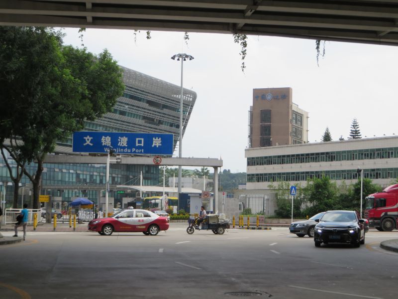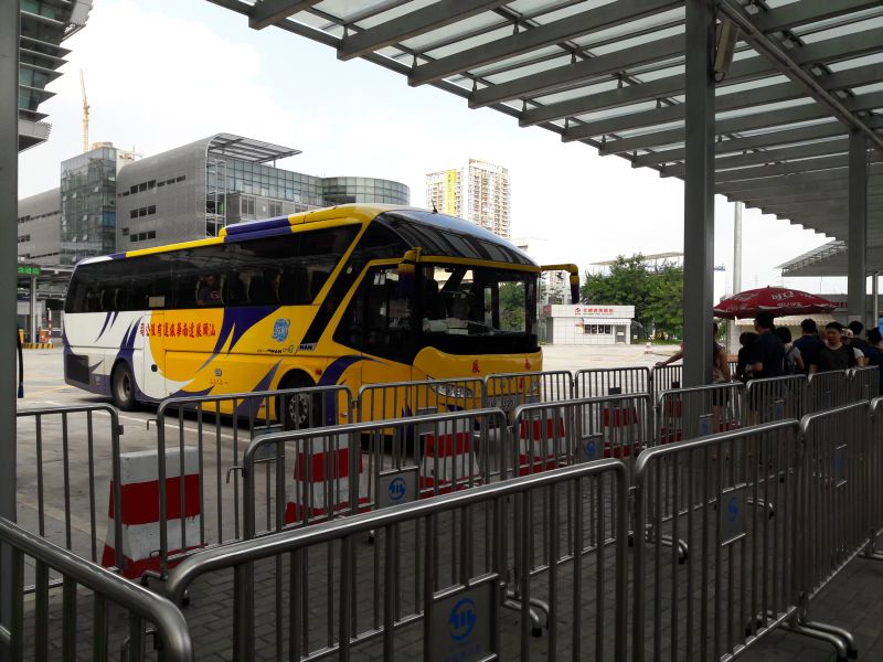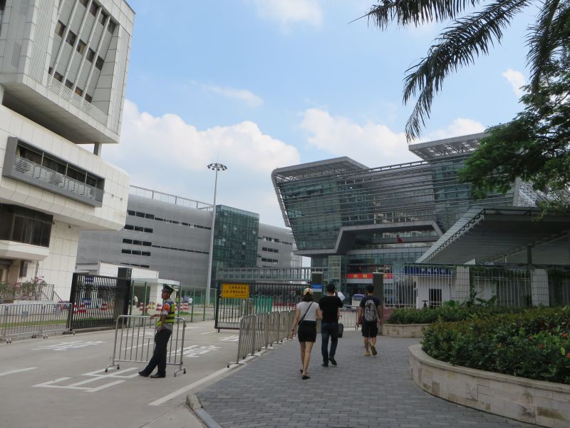 地下鉄の湖貝駅からは、横断歩道があったりなかったりする道を10分ほど歩けば、国境施設に到着します。真新しく、無意味に巨大な建物の上階に通じるエスカレーターを上れば、がら空きの出国審査場があります。再びエスカレーターで地上に降りたところにバス乗り場があり、香港の上水駅や市街地行きのバスが出ています。