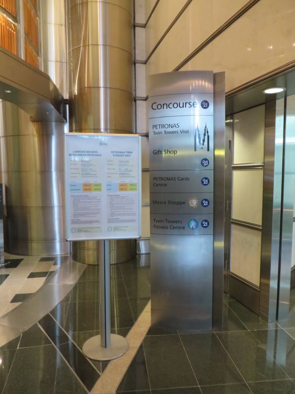 最寄はKLCC駅ですが、モール(スリアKLCC)に入ってしまうと、展望台への入り口が分かりにくいです。タワー側のビルの正面玄関から入ったほうが、分かりやすいかもしれません。その割に、案内に乏しいことは否めません。