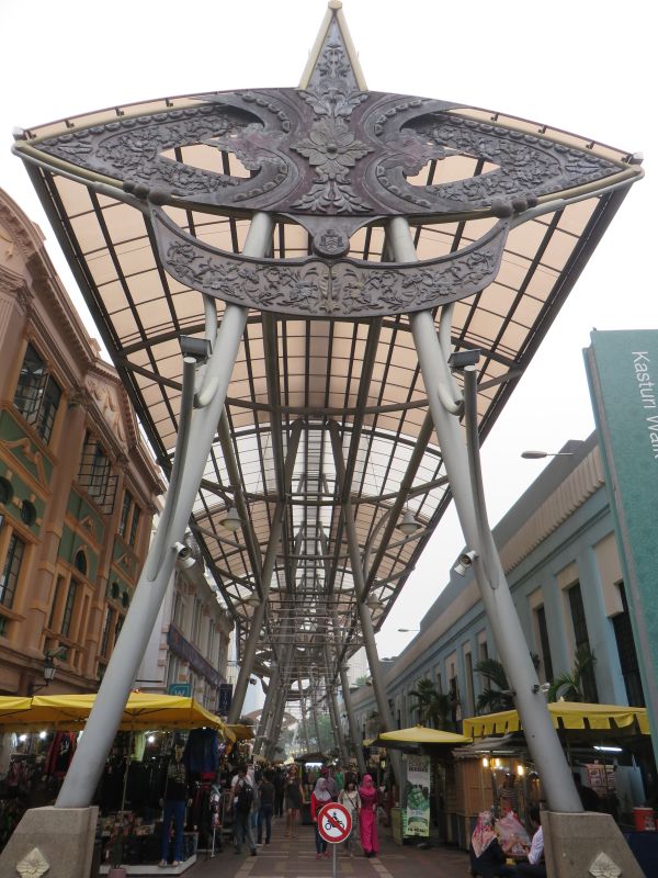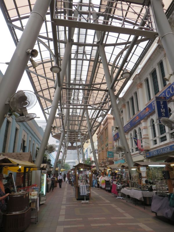 特徴的なカタチのアーケードがかかっているので、分かりやすいかと思います。通りの両側、およびセンターに移動式(?)の屋台がずらっと並び、飲み物、フルーツや、雑貨などを販売しています。チャイナタウンのような、「ごちゃごちゃ」感じはなく、またセントラルマーケット(内部)のような窮屈さもないのですが、どこか小奇麗さ・さっぱり感があり、屋外(=冷房が効いていない)なので、アジアっぽさは感じにくいかもしれません。- 旅行時期