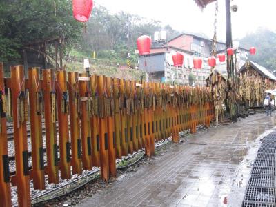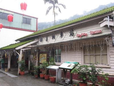 台北市内からバスを乗り継いで来たため、乗り過ごす羽目に。それだけ、目立ちにくいトコロ(実際、駅舎はバス道路から奥まったところにあるので)に・・・。石炭の積出用の大きな施設がある駅構内とは違い、こじんまりとした駅舎とその左手にある鉄道関連の土産物屋、正面の小道を挟んで土産物屋兼食堂が何軒か。少し歩くと、渓谷沿いに見所がいっぱい。