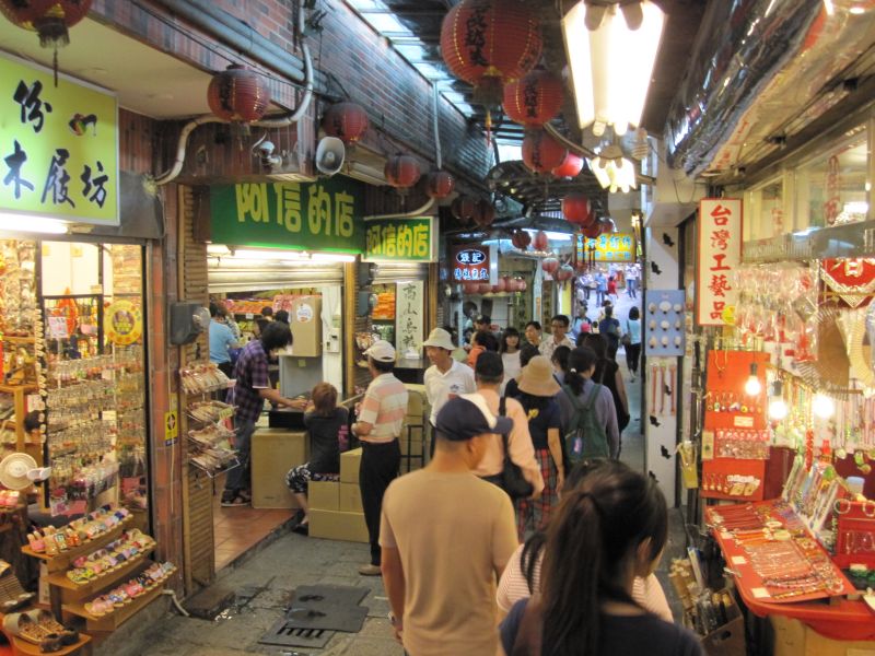 台北、基隆などからの路線バスを、目印でもある「セブンイレブン」前で降りたら、そこからひたすらアーケードのある商店街が「基山街」。両側には、土産物屋、食堂、名物の豆腐や肉料理を売る屋台・・・。雰囲気は満点ですが、ただでさえ狭いうえに、原付や軽トラなどに出くわしたときには、ゆっくりウインドーショッピングなんてしていられません。その上(わたしは問題なかったのですが)、食堂などから出てくる調味料、香辛料などの臭いがきついので、「早く帰りたい・・・」という同行者も。それだけ、「ディープ」ということの裏返しでしょうか。