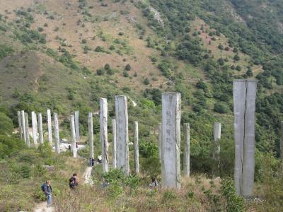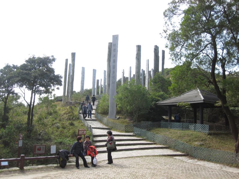 ポーリン寺から、案内表示を頼りにクルマがやっと通れそうな山道を歩くこと約15分、目の前にそびえる鳳凰山(Lantau Peak)と、得体の知れないいくつもの石柱。