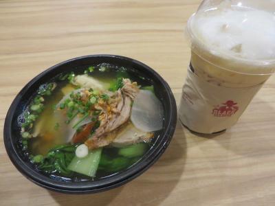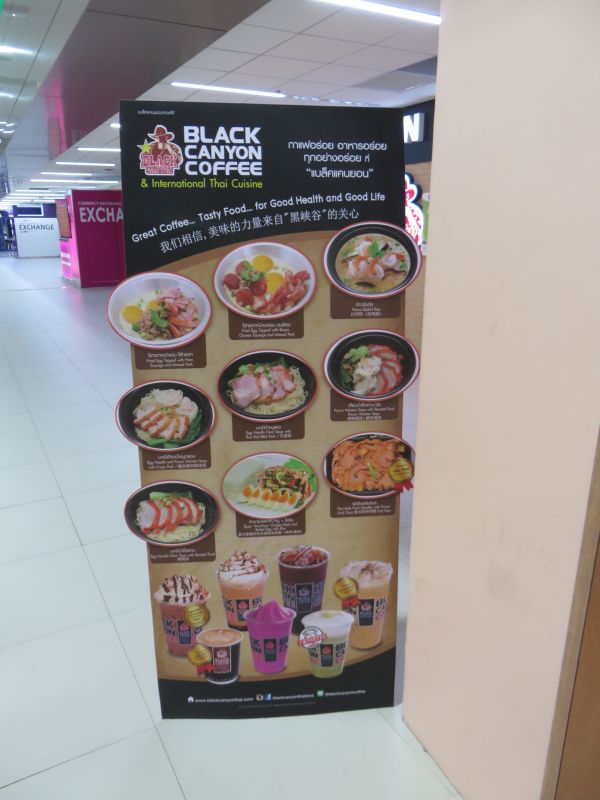 街中の店舗に比べるとこじんまりとしていて、ファストフード的な雰囲気でした。本格的な昼食をとりたかったので、ラーメンと、アイスカフェラテをを注文しました(あわせて205バーツ)。お昼時(12時)だったため、混雑していましたし、到着ロビーという場所柄せわしなく、落ち着いてコーヒーを飲む・・・という感じではありませんでした。