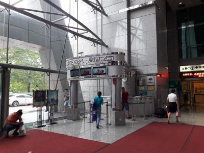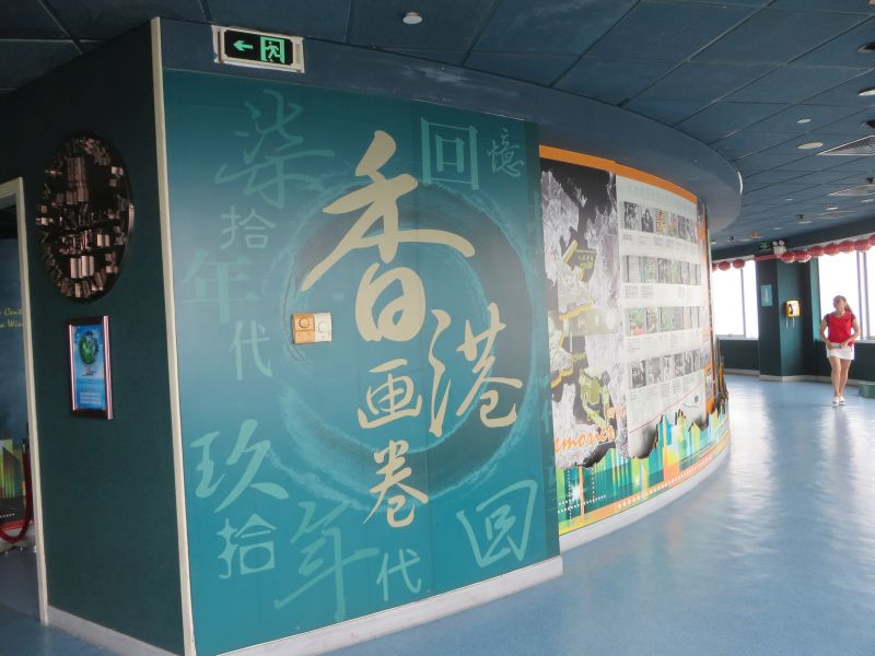 1階のすみにある切符売り場でチケットを購入し、あたふたしているうちに、係員さんにエレベーターまで案内してくれました。一度乗り換えをしたのち、展望フロアまで上がるのですが、この日は雨が降っていたため、西・南側の窓は水滴だらけで、あまり展望は・・・。どちらかというと、香港に関する展示物や、映像のほうが面白かったりします。一人80元ですが、このフロアにある軽食スペースでの割引チケットも含まれていたことが救いです。