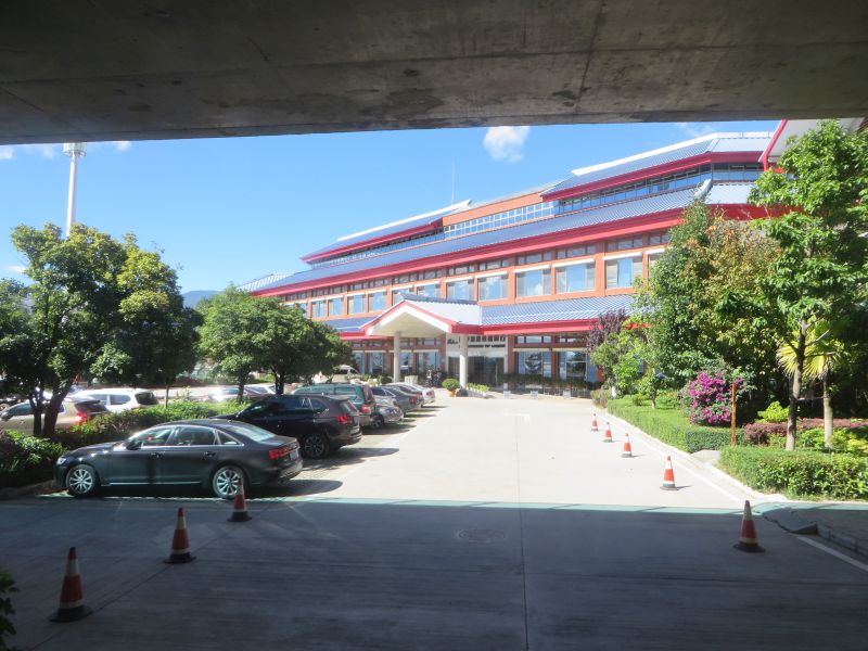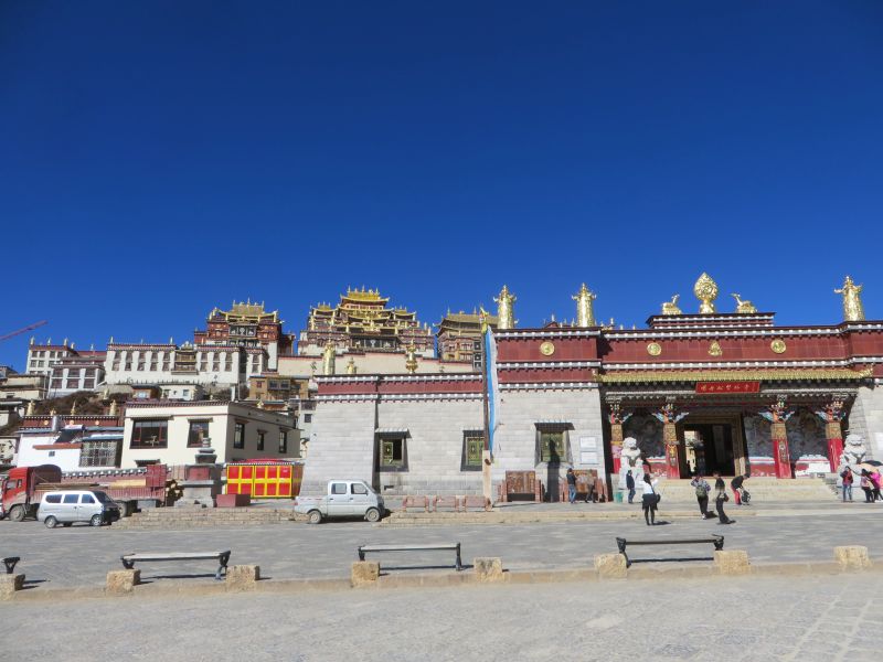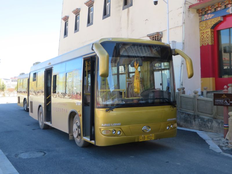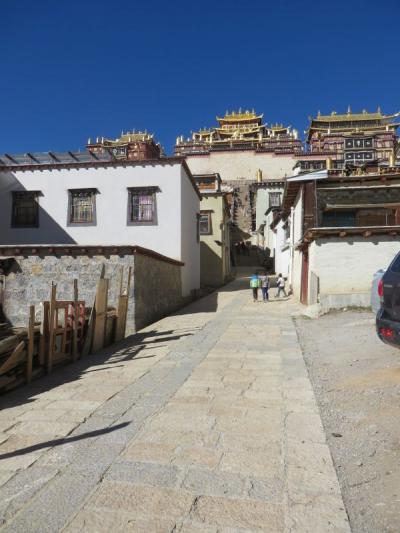 麗江よりバスで4時間、シャングリラ市内の独克古城エリアからは、松賛林寺行きの市内バスを見つければ、それに乗り込むだけです。10分程度で、施設入口の観光センターのようなところで下され、入場券の購入を迫られます。その裏手にあるアクセスバスに乗り換えるのですが、歩いても10分程度で施設入口の正門に着けそうな距離です。