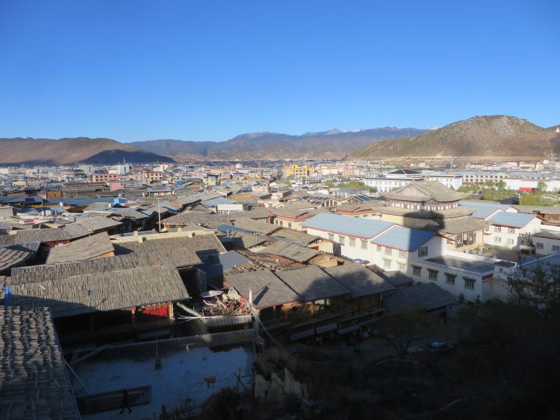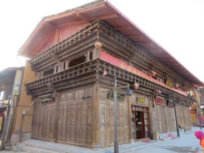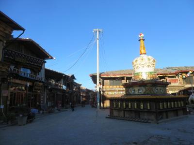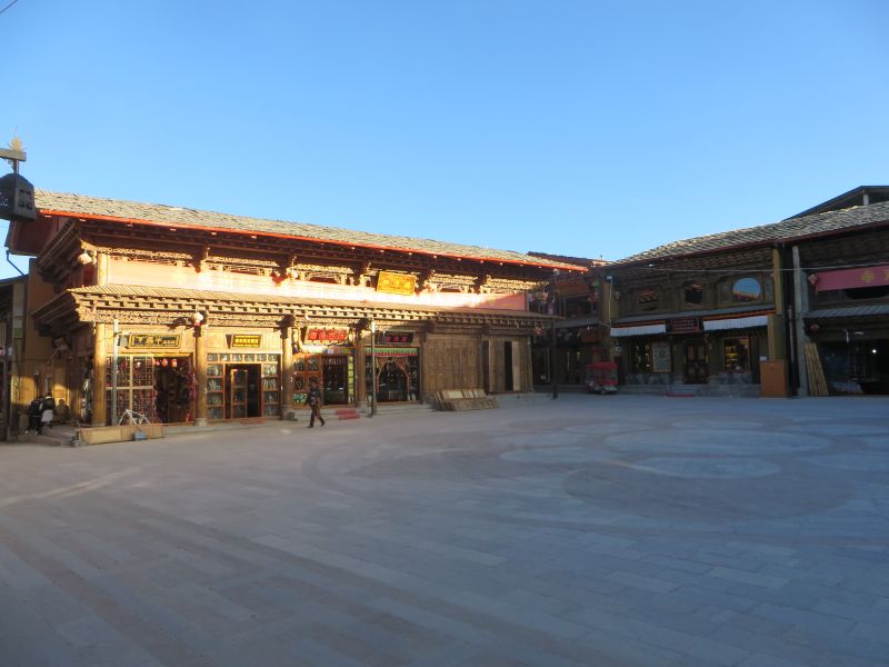 シャングリラ市街地の南端に位置します。どこが入口かわからないので、いつの間にか「あれ?エリアに入った?」という感じです。中心部の四方街より北側は平たんですが、そこから南側、亀山公園エリアにかけては起伏があり、道が狭くなっています。四方街からは東に亀山公園エリアにかけてが、食堂、カフェや土産物屋、などが建ち並び、にぎやかなエリアです。