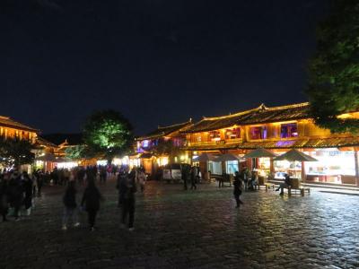 「古建築保護費」を支払う関門を通り、さらに歩きすすんだところにこの広場がありました。広いわけではないですが、演劇などを行う舞台がありその周りには、土産物屋や食堂などの店が建ち並んでいます。車が入り込まない奥まったところですが、いろいろなところへ行くための道が交差していることもあり、昼間も、日没後も人であふれています。