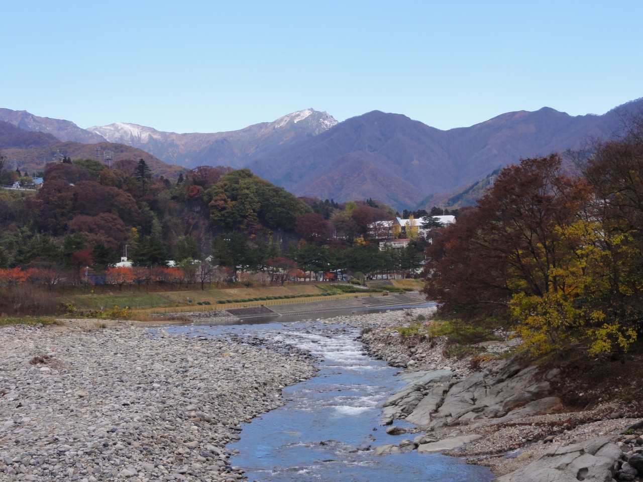 谷川岳や高架橋を上に見ながら紅葉と川の流れがきれいです。