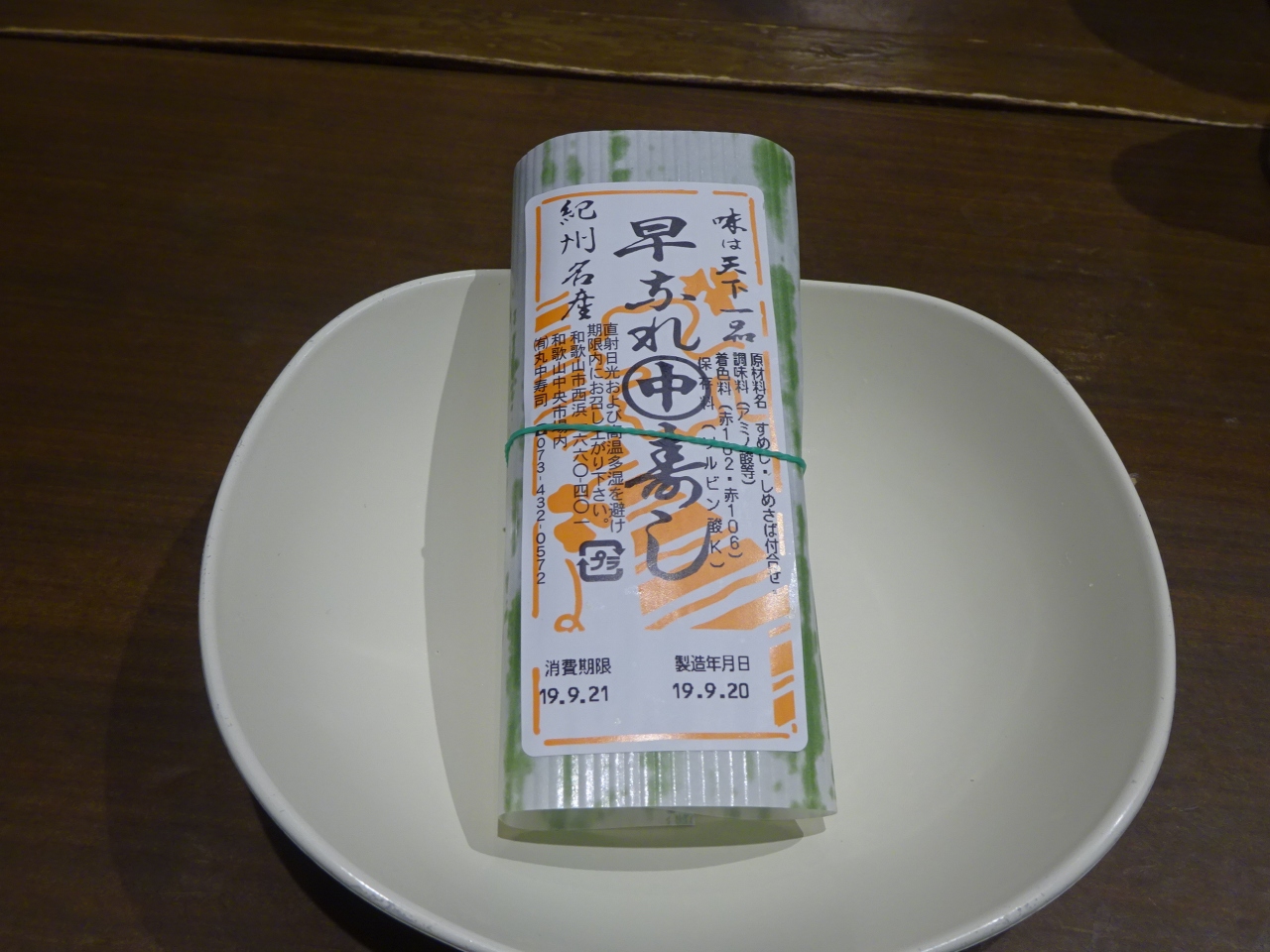 和歌山ラーメンのお店では、「早寿司」というさばの押し寿司と一緒に食べるのが一般的のようで、このお店でもカウンターの所に置いてあり、テーブル席でも注文するとすぐに出てきました。