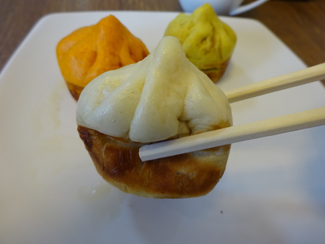 焼きショーロンポーは、要するに小籠包を蒸さないで焼いたもの。味が3種類ありますが、外側の皮の味が異なるだけで中身は同じです。