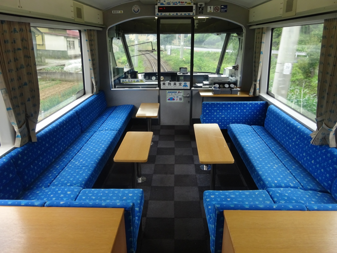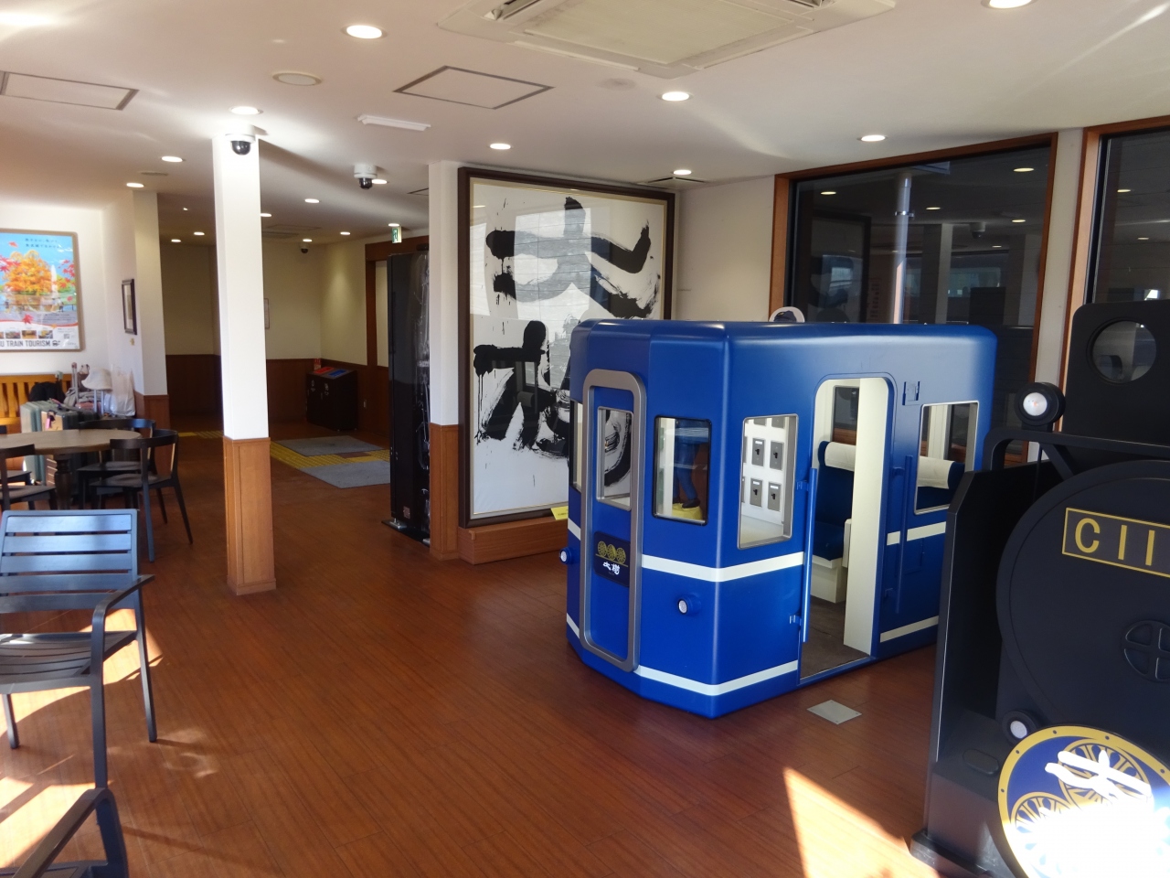 一方、1号車だけは手が加えられていて、特に富士山寄りの先頭部分はサロンになっています。運転席の後ろには模擬運転台もあって子供たちが喜びそう。富士山を眺めることを意識したレイアウトです。