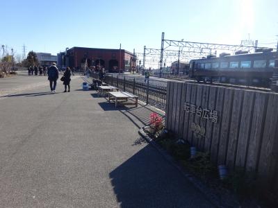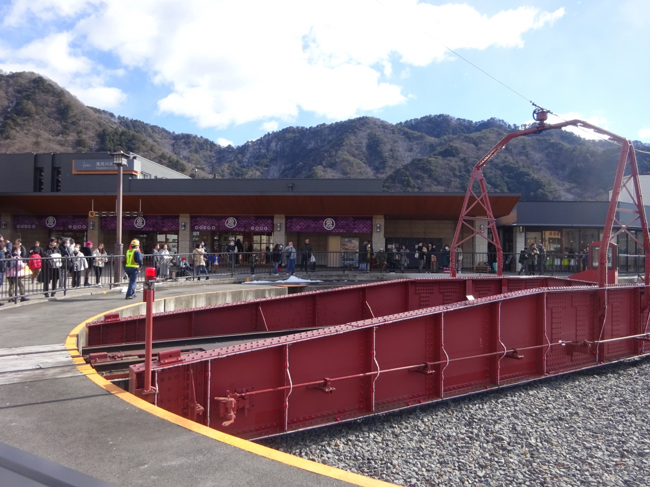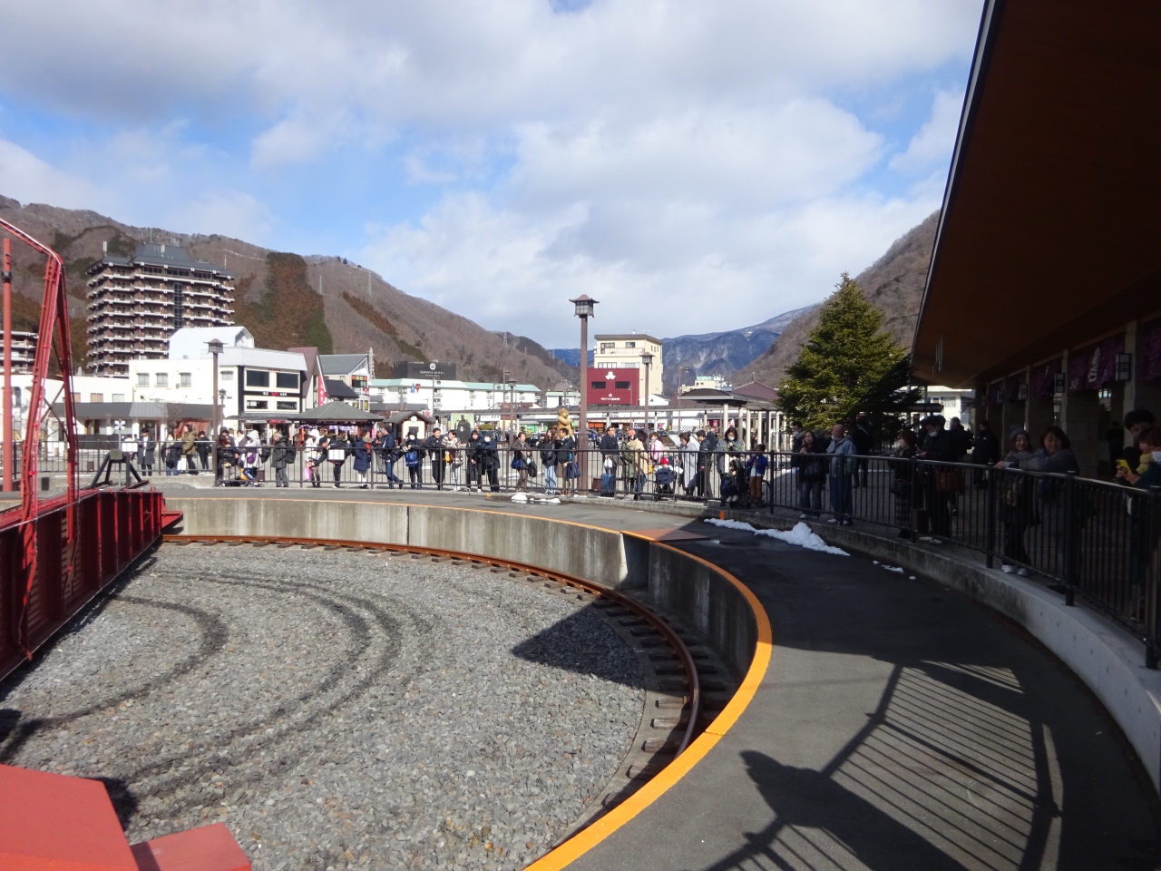 東武鬼怒川線を走るSL大樹の蒸気機関車が、この駅で折り返すために向きを変える転車台が、駅前広場にあります。通常、このような転車台は駅構内の端っこにあったりしますが、わざわざ駅前広場に設置することによって、機関車を回転させること自体を観光の売りにしています。東武鉄道さん、うまいこと考えるなあと思ってしまいました。