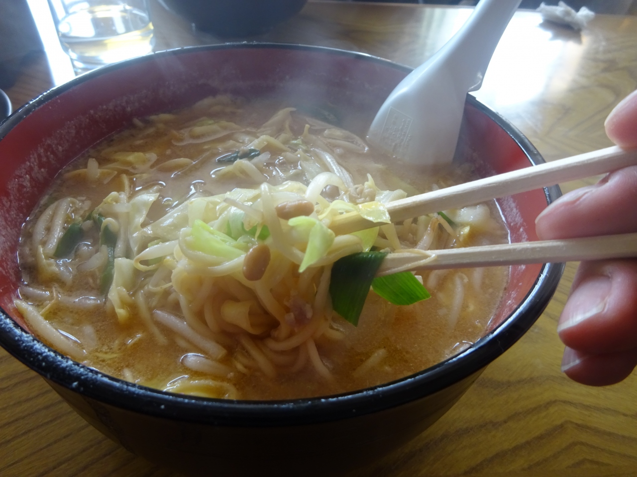 私はそんな中、「みそ納豆ラーメン」を注文。山形の郷土料理でもある「納豆汁」に掛けたのではないかと思いますが、大量の野菜に納豆が乗ったみそラーメンでした。納豆はコーンラーメンのコーンのように底に沈んで食べにくかったですが、とにかくボリュームがあって食べごたえがありました。