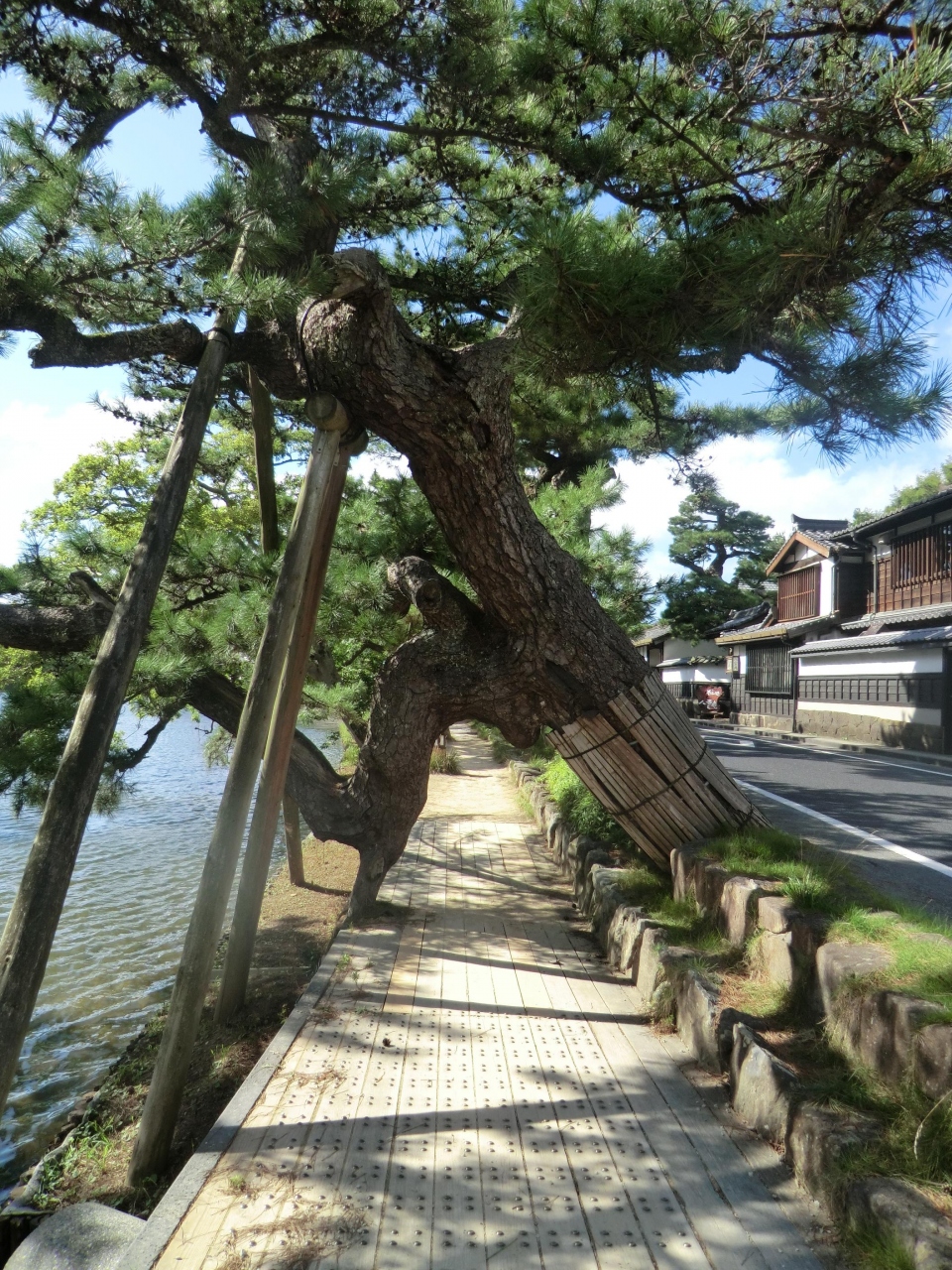 松江城の北側、堀を挟んだ向こう側に並ぶ古い住居群。道路沿いに小泉八雲旧宅をはじめ古い武家屋敷風の家屋が並んでいました。堀沿いには松の並木がかなり節くれだって立っています。城下町のたたずまいが最も残っている場所ですね。