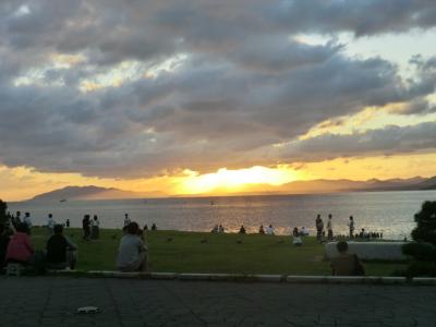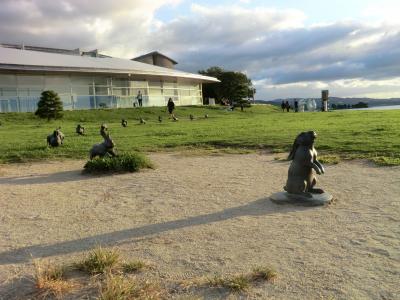 ロビーから夕陽を見ている間に、湖畔に並んだ12匹の「宍道湖うさぎ」を見に行きました。湖から2番目のウサギに西を向きながら触ると幸せが訪れる、と言われているそうです。- 旅行時期