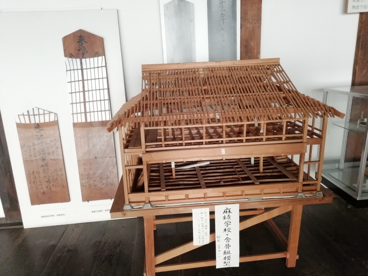 元善光寺から徒歩で10分ほどの距離に、旧座光寺麻績学校校舎が保存されています。明治6年に歌舞伎の舞台と学校を兼ねて建てられたというユニークな歴史の学校建築です。舞台裏には中2階があり、そこには寺子屋時代からの教科書は現存しており展示されています。