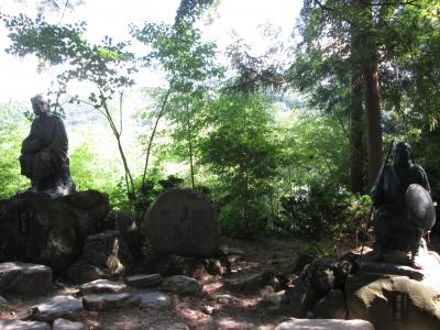 宝珠山の麓に近い場所にある宝物殿の近くにあります。参道を進むと見つけることができますが、地味な存在なので、気が付かないで通過している人が多いと思います。松尾芭蕉が訪れたことで有名な山寺で、句にも詠まれたということから、像が建立されたとのことです。