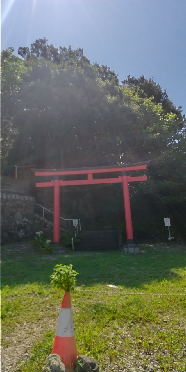 小さな漁港のそばに、赤い鳥居を見つけたので立ち寄りました。木造のお社が歴史ある雰囲気でした。ちょうど急カーブに位置する上に道路沿いに停める場所もなく、そのまま見過ごしてしまいそうでした。危なくはないですが。