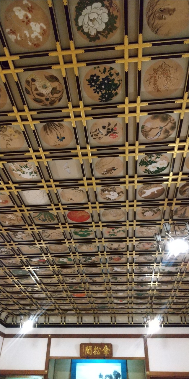 靴を脱いで建物に上がり、鐘楼も報恩塔も建物の中から見ることになります。非常に行動を制限された拝観です。天井に230枚の日本画が描かれた「傘松閣」は、独特の空気感がありました。