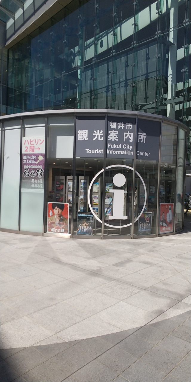 駅前のしゃれたビルです。今回は駅周辺をぶらっとしたかったので福井駅周辺観光マップをいただき、北の庄城址への道案内をしていただきました。 円形の特徴的な建物です。福井市内だけでなく、県内全域の観光パンフレットがもらえました。