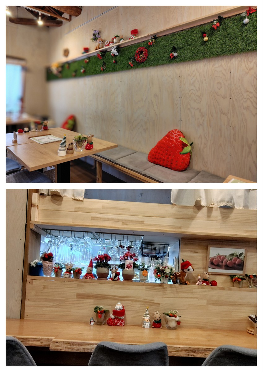 店内は2人掛けのテーブル席が7脚とカウンターがありますが狭いです。テーブルや棚等にぬいぐるみや置物が置いてあり、12月はクリスマス飾り付けとなっていてかわいらしい店内です。