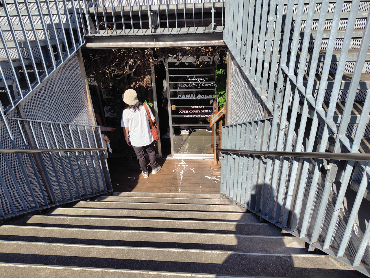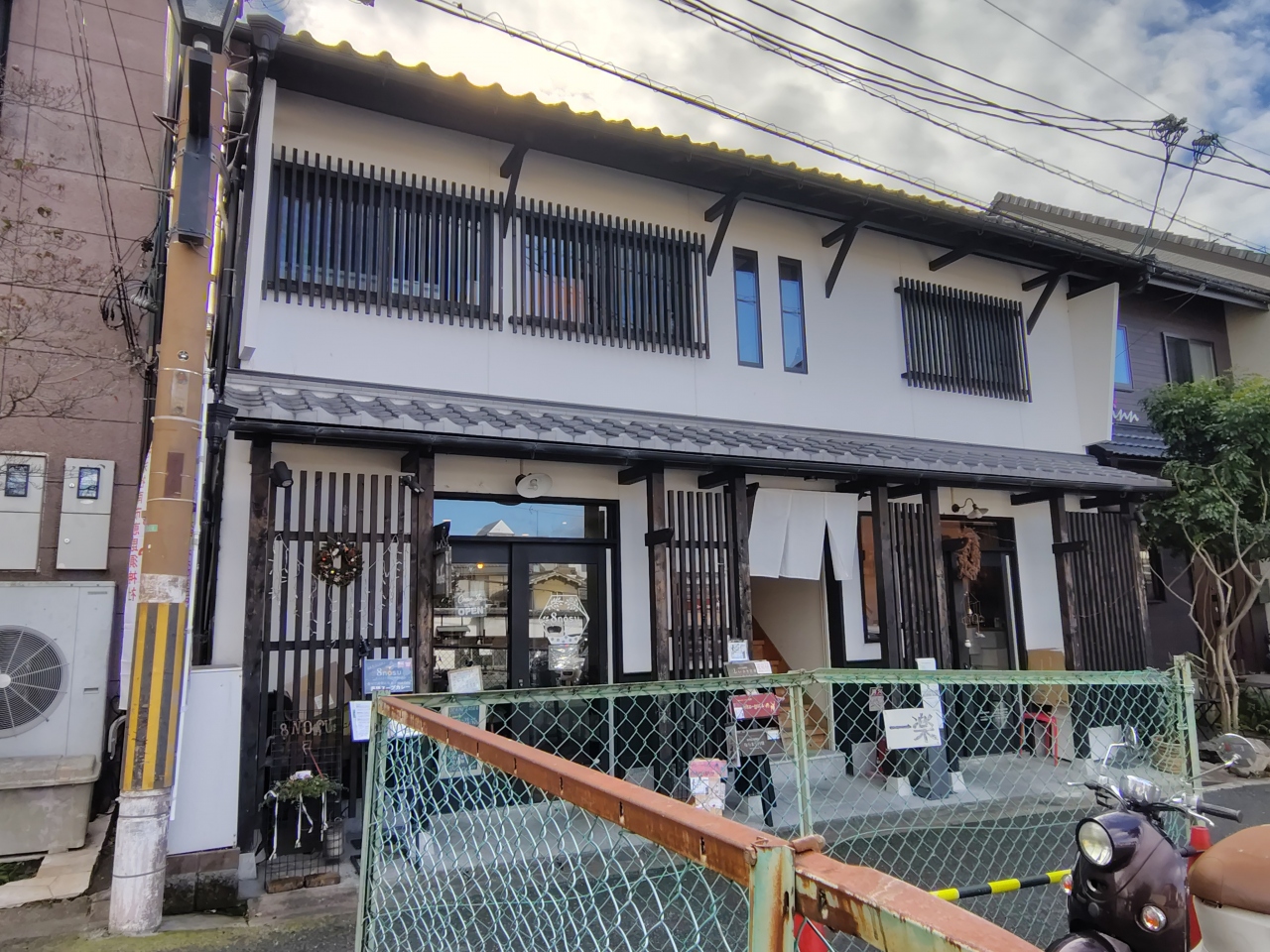 近鉄奈良駅から南へ徒歩10分ほどの狭い路地にあります。近鉄奈良駅を出て、東向商店街を通り抜け、三条通りへ出たらあの高速餅つきで有名は中谷堂を右折し、餅飯殿センター街を南下。柿ならが見えたらその丁字路を左折。左が駐車場のところの右側ににこぐささんが入った建物があり、にこぐささんはその2階になります。