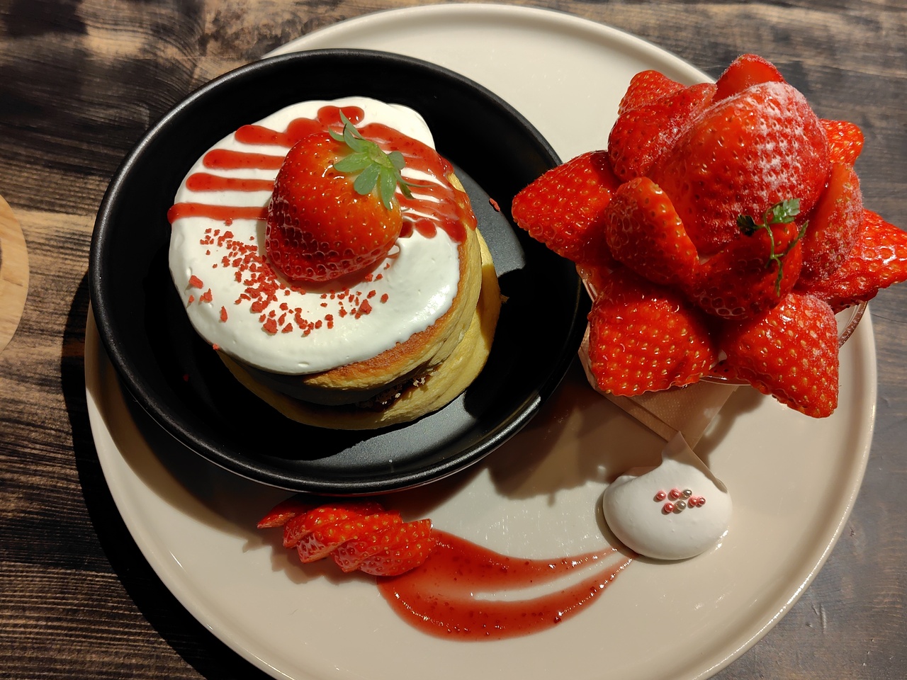 ふわふわのパンケーキ。生地自体は、生クリームとあすかルビーの味の邪魔にならないようにか、あまり味はついてないように思います。