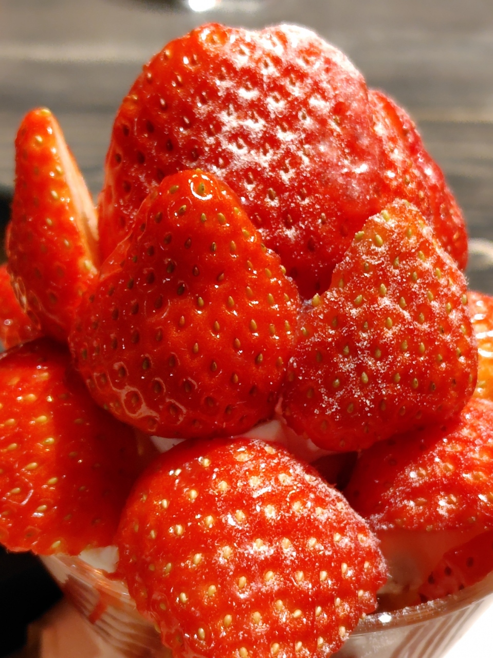 いちごパフェ極には、小粒ですがたくさんの古都華が使われており、高さはどうでしょう、30cmとまではいかないですが食べ応えありの大きさです。